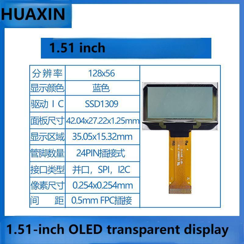 1.51-inch transparent OLED display with 128×56 resolution, 24-pin plug-in interface. Ideal for smart windows, creative electronics, and self-luminous transparent screen applications.